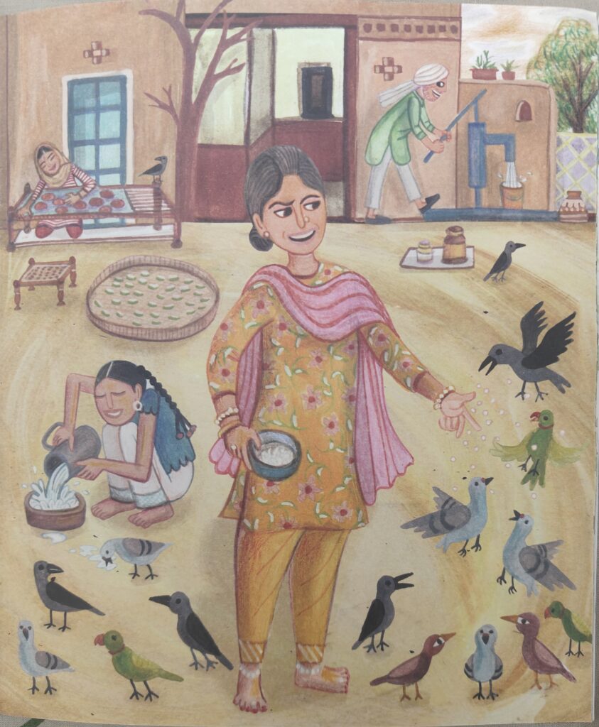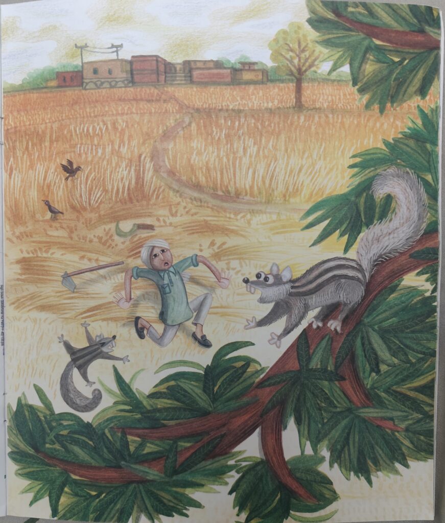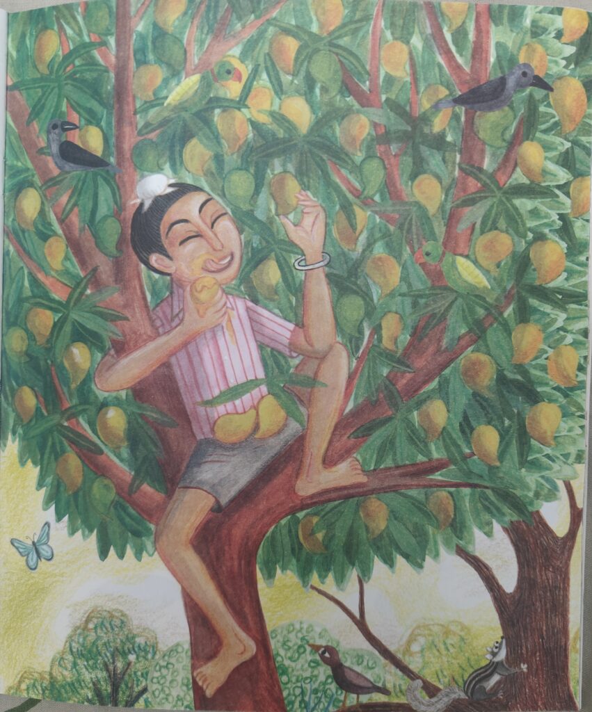 जो किसान था न उसको जो सज़ा मिलीं जिसमें पहले चिड़िया को खाना देना था तो वो बोल दिया वो तो हम रोज़ देते हैं। फिर पानी पिलाने की बात आई तो उस पर भी कहा कि हम रोज़ देते है हैं और फिर आम की बात आई क्योंकि उस लडके को आम पसंद था। इस्मने हमको आमा चुराने वाला अच्छा लगा।