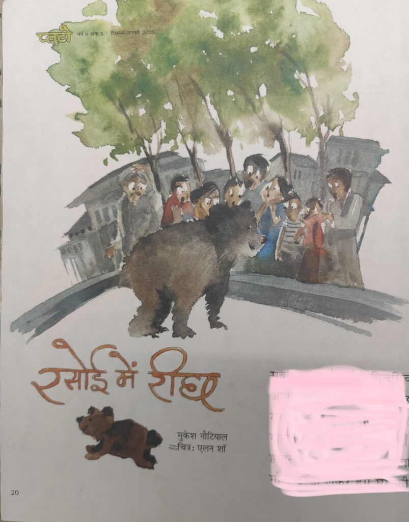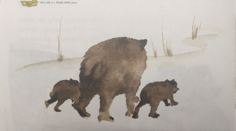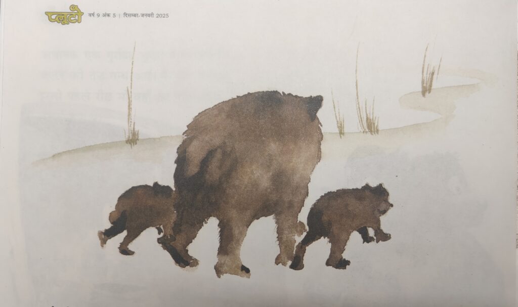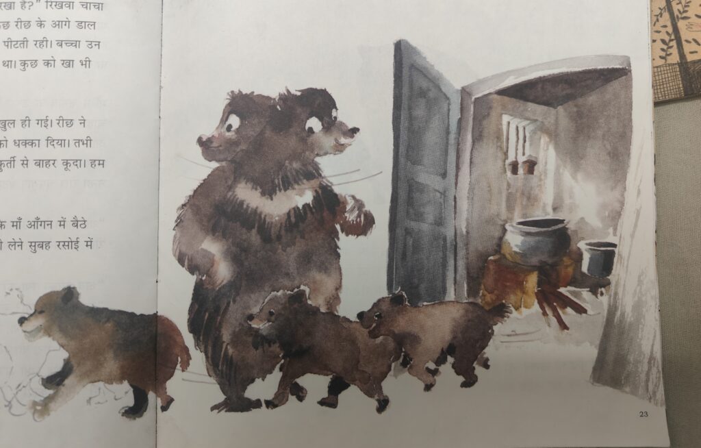 अभी लिखते हुए कहानी का आख़िरी वाक्य अटक गया है कल इस पर बच्चों से बात करूंगी। फिलहाल कहानी में वन्य जीव के प्रति मनुष्यों की सहज प्रतिक्रिया ही कहानी का आकर्षण है। मां, बच्चे और गांववालों का जंगल में आग लगने से रीछ के बच्चे का घर के आँगन में आना और फिर आगे की कहानी का बढ़ना ऐसा लगा जैसे किसी पहाड़ के नीचे गाँव में अपना घर है और रीछ आ गया है। ‘रीछ की तरह तो हमारी नाक हो सकती नहीं’ इस एक वाक्य में कहानी भी है और ज्ञान भी।